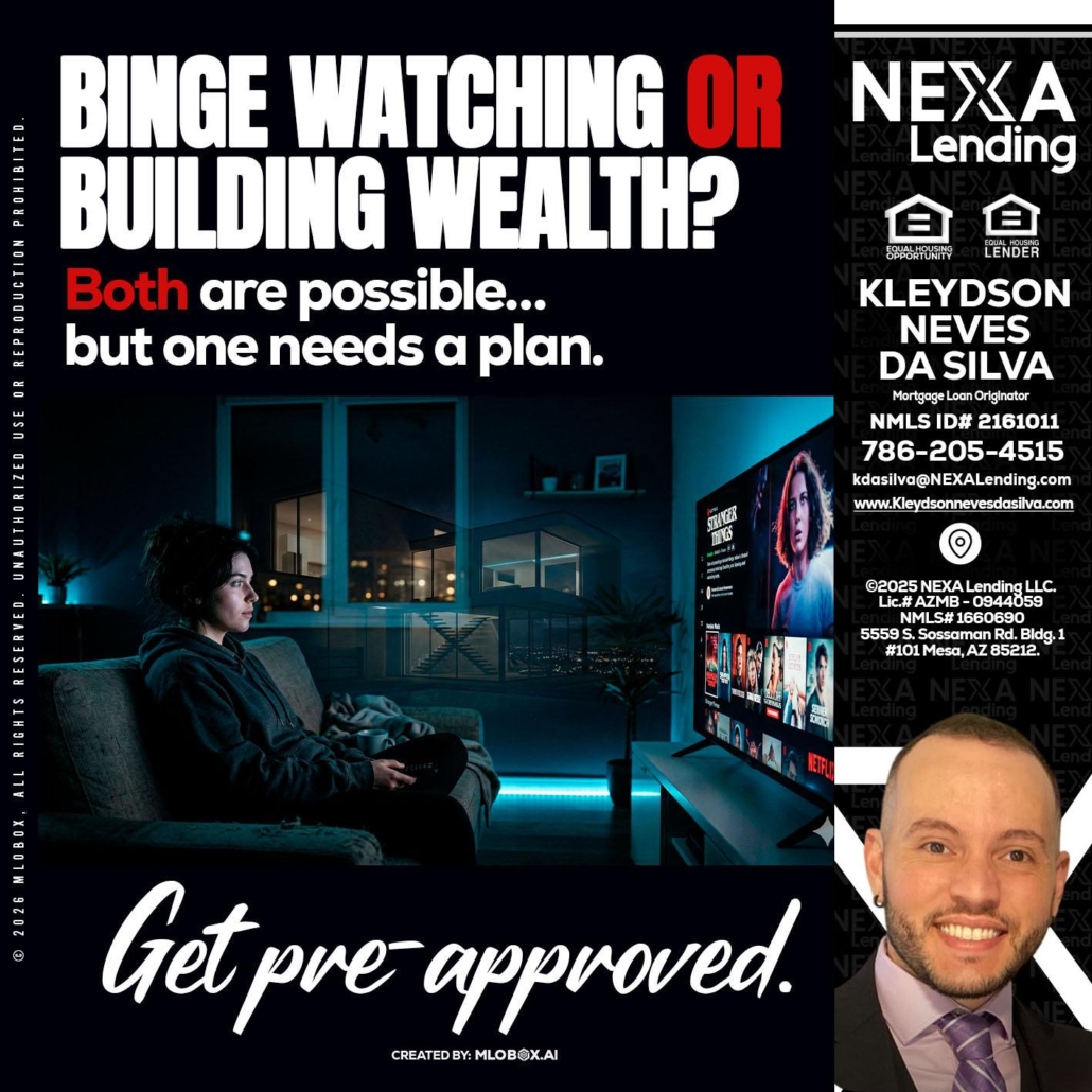BINGE WATCHING - Kleydson Neves Da Silva -Mortgage Loan OriginatorHi, my name is Kleydson Neves Da Silva. I’m a Loan Officer with NEXA Lending LLC., offering personalized mortgage solutions, fast customized quotes, great rates and service with integrity.